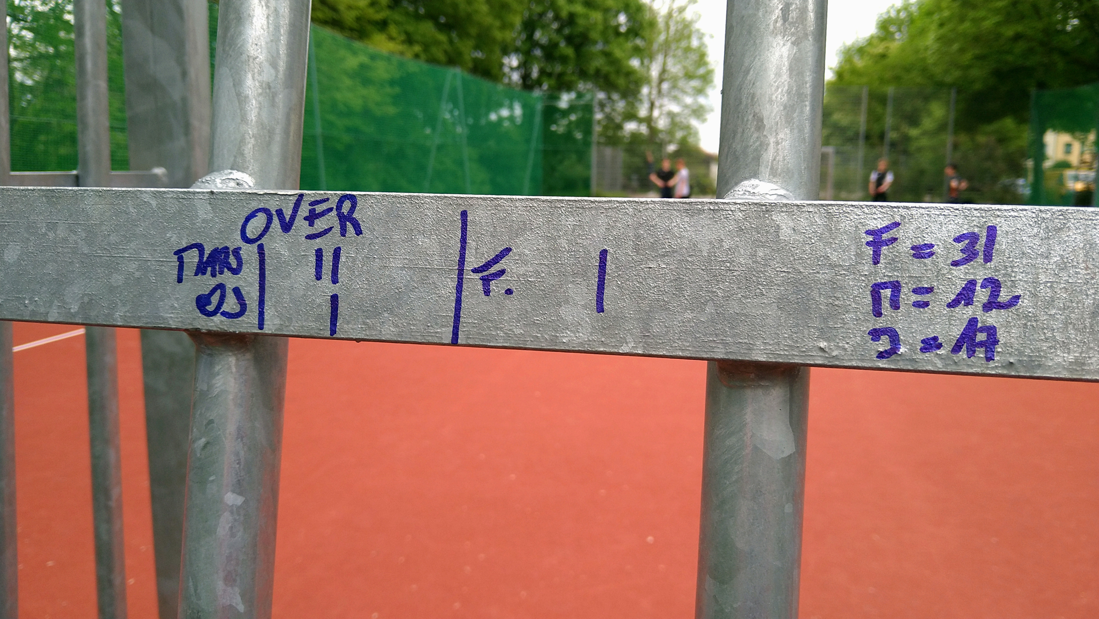 Zwar wurden immer wieder Trinkpausen eingelegt, doch der durchaus weitläufige Platz (der kleine schnuggelige HaldenKäfig wurde vermisst) machte sich in so manchen Beinen bemerkbar, zudem wurden vermehrt die Flankenläufe auf der SchattenSeite gesucht - GoldenGoal wurde eingeläutet, welches dann ziemlich schnell erzielt (erneut Simon?)wurde.