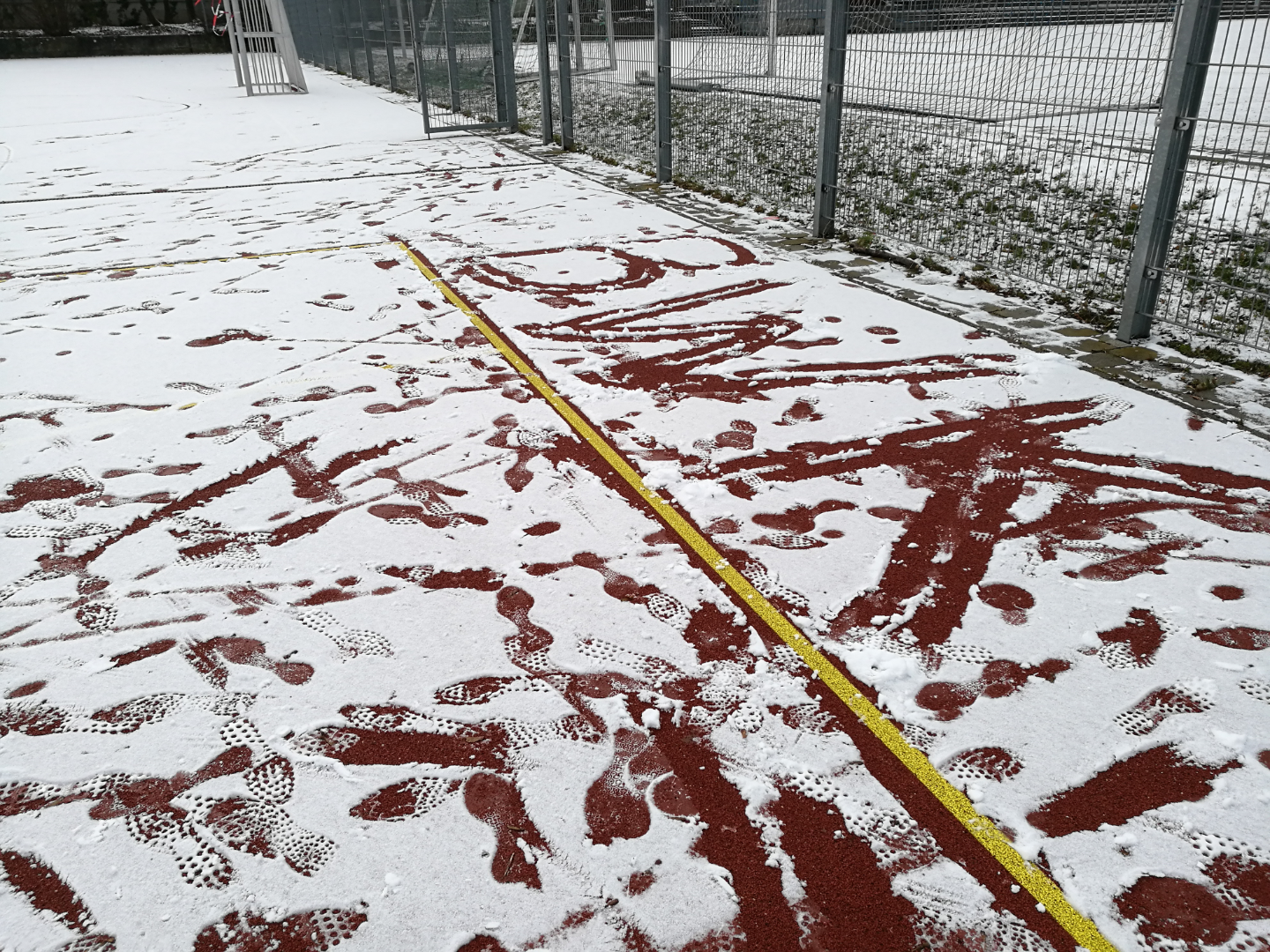 15.01.2017 da an diesem Sonntag noch weniger vom rotenUntergrund zu sehen war, gab sich unser LinienBeauftragterKKC die Ehre - mit seinem fahrbaren LinienZieherUntersatz fuhr er als Erster im BreitWiesen ein, verpeilte es allerdings die richtigen Markierungen zu ziehen (lag wohl am feuchten WinterGrillen tags zuvor) - so galt es für alle 4 Anwesenden die Linien im SchneeFeld zu ziehen, damit `ne TEMPO eröffnet werden konnte. Hierbei galt es auf dem rutschigen Geläuf das Gleichgewicht zu halten, die Lauf-und Flugbahnen des Balles zu peilen & natürlich dem SchneeBallHagel zu entkommen. Mars hatte noch mit der WeihnachtsFeier zu kämpfen, kassierte zwar keine LooserPoints (Mistake4,KKC1), doch nimmt den Titel als erster ZaunKönig2017 mit (was bei geöffnetem Zaun nicht weiter tragisch war). Sonnenschein und vor allem FußballSchuhe ließen mit der Zeit wieder das eigentliche FußballFeld zum Vorschein kommen, sodaß zum BENZ auf`s gegenüberliegende Tor gewechselt wurde....Marksters alias Thommy sah sehr unterkühlt aus, so kassierte er in kurzer Zeit zwei FaceShots *sorry man*