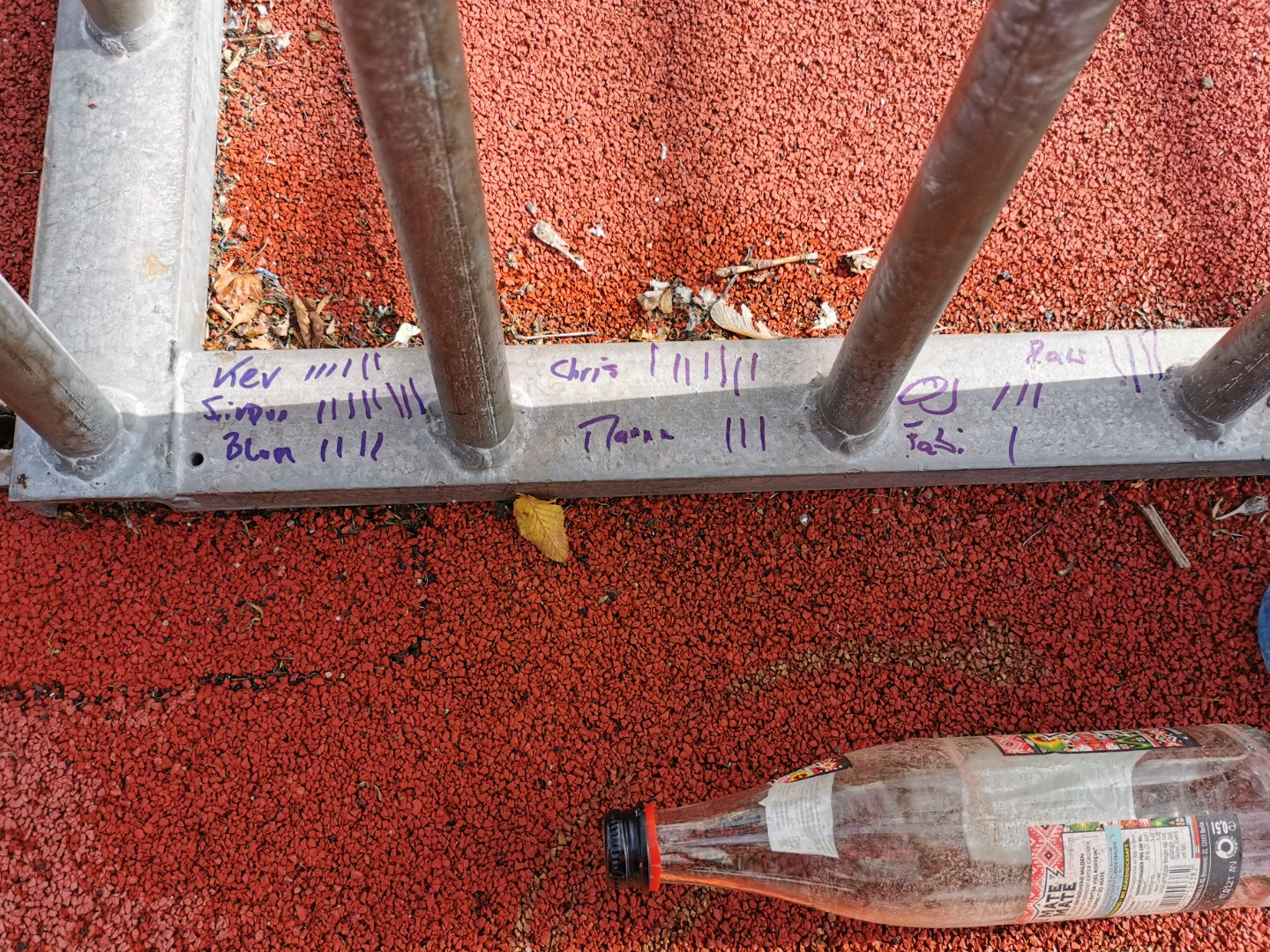 15.12.2019 nachdem der Vorsatz "sich vorm Rathaus fest-zu-ketten, DauerGrillParty aufm Tartan oder sonstige Streiks" nicht umgesetzt wurde, war natürlich der Beschluss der schönen Stadt Gerlingen schneller durchgesetzt als selbst Ulle hätte dem Ball hinterhergucken können - auf jeden Fall waren die Bagger scho recht weit vorgerückt, als Mars,Blum & OJ an diesem Sonntag endlich mal wieder die Kugel ins SportGelände trugen. Die lange Pause ohne Leder am Fuß machte sich bemerkbar - Blümchen hattte schwer damit zu kämpfen die Bude überhaupt ansatzweise zu treffen, was vielleicht auch an den letzten Ausläufern der Grippe lag - in der TEMPOrunde verlor er aber schnell seine Punkte & selbst die 6 erkämpften BonusPoints wurden schnell verprasst...zwischendurch gab es noch ein ZaunBattle mit Mars, welches Blum aber auch für sich entschied...waren es 4 oder 5 OverTheFence, jedenfalls RekordVerdächtig !!! Manche Legenden benötigen den Auftritt im Scheinwerfer(Sonnen)Licht, und so sollte es sich an diesem Tage wieder zu einem richtig passenden Zeitpunkt ereignen, das MisterMistake im gewohnten kurzeHoseOutfit sich die Ehre gab. Da Kölle sowieso genug kilometer durch Ball_holen hinter sich hatte und kurz vor dem Abpfiff stand, kam die fehlersche Unterstützung natürlich für Alle mehr als passend....ein BENZ wurde eröffnet, bei welchem noch alle 4 Akteure mitbenzten....hierbei verabschiedete sich Blüüüm als Erster mit 0 Punkten & weiter gings zu Dritt - zwar wurden keine Penalty-und ElferRunden mehr ausgespielt, doch Mars hatte seine Points als Erster verprasst, richtig !!?!??